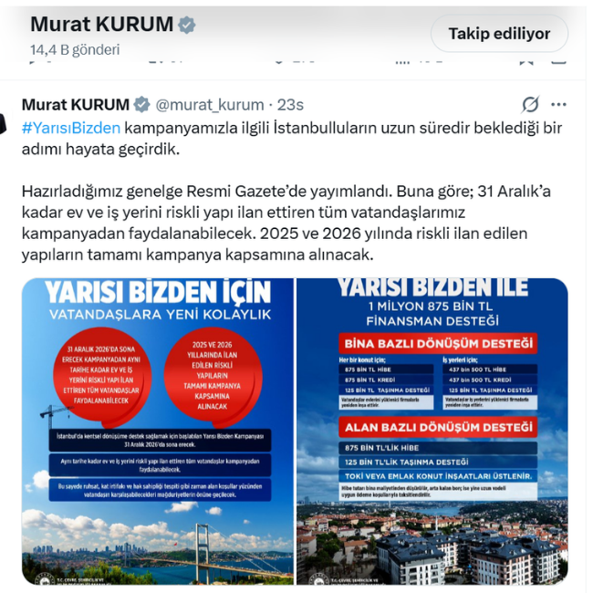 Çevre, Şehircilik ve İklim Değişikliği Bakanı Murat Kurum, İstanbulluların depreme karşı daha güvenli yaşam alanlarına kavuşması amacıyla yürütülen "Yarısı Bizden" kampanyasında beklenen adımı attıklarını sosyal medya hesabından duyurdu.Bakan Kurum, Resmi Gazete’de yayımlanan Cumhurbaşkanlığı Genelgesi’ne ilişkin yaptığı açıklamada şu ifadeleri kullandı:“Yarısı Bizden kampanyamızla ilgili İstanbulluların uzun süredir beklediği bir adımı hayata geçirdik. Hazırladığımız genelge Resmi Gazete’de yayımlandı. Buna göre; 31 Aralık’a kadar ev ve iş yerini riskli yapı ilan ettiren tüm vatandaşlarımız kampanyadan faydalanabilecek. 2025 ve 2026 yılında riskli ilan edilen yapıların tamamı kampanya kapsamına alınacak.”Kampanyanın kapsamı genişletildi22 Şubat 2024’te Cumhurbaşkanı Kararnamesi ile yürürlüğe giren "Yarısı Bizden" kampanyası, İstanbul’da kentsel dönüşümü hızlandırmak amacıyla başlatılmıştı. Vatandaşlara evlerini yeniden inşa ettirmeleri için 875 bin TL hibe, 875 bin TL kredi ve 125 bin TL tahliye desteği olmak üzere toplam 1 milyon 875 bin TL destek sağlanıyor.Yeni düzenlemeyle, riskli yapıların yıkım, ruhsat, kat irtifakı ve hak sahipliği tespiti gibi zaman alan süreçleri nedeniyle oluşabilecek hak kayıplarının önüne geçilmesi hedefleniyor. Böylece 31 Aralık 2026 tarihine kadar riskli yapı olarak tescil edilen tüm bağımsız bölümler kampanyadan doğrudan yararlanabilecek.Kentsel dönüşümde yeni fırsatBu gelişme, özellikle deprem riski yüksek İstanbul’da yaşayan vatandaşlar için önemli bir kolaylık sağlıyor. Riskli yapı ilan sürecini tamamlayanlar, bürokratik aşamaların tamamlanmasını beklemeden devlet desteğinden faydalanma hakkına sahip olacak.Bakan Kurum’un açıklamasıyla birlikte kentsel dönüşüm başvurularında artış beklenirken, kampanya İstanbul’un depreme hazırlık çalışmalarında kritik bir rol oynamaya devam ediyor.