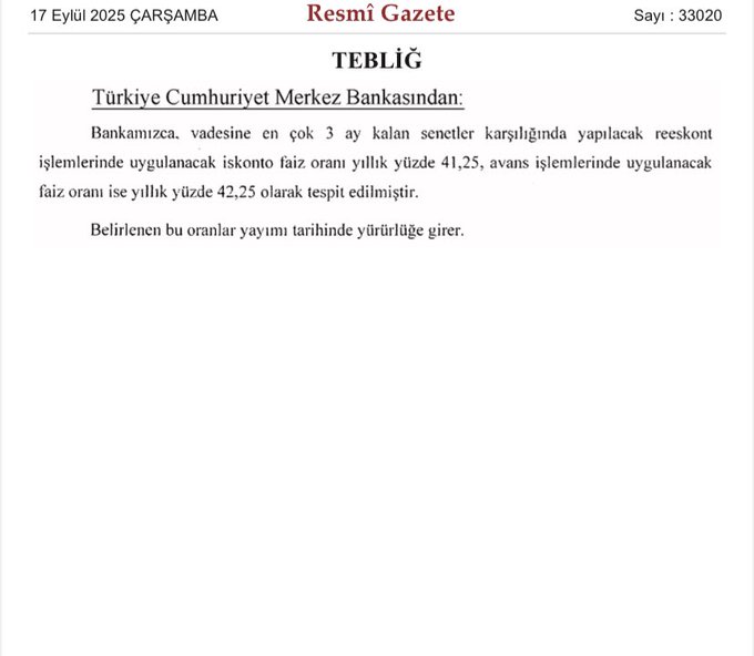Türkiye Cumhuriyet Merkez Bankası (TCMB), reeskont ve avans işlemlerinde uygulanacak faiz oranlarını yeniden belirledi. Resmi Gazete’de yayımlanan tebliğe göre; vadesine en çok 3 ay kalan senetler karşılığında yapılacak reeskont işlemlerinde uygulanacak iskonto faiz oranı yıllık yüzde 41,25 olarak tespit edildi. Avans işlemlerinde uygulanacak faiz oranı ise yıllık 42,25 oldu.