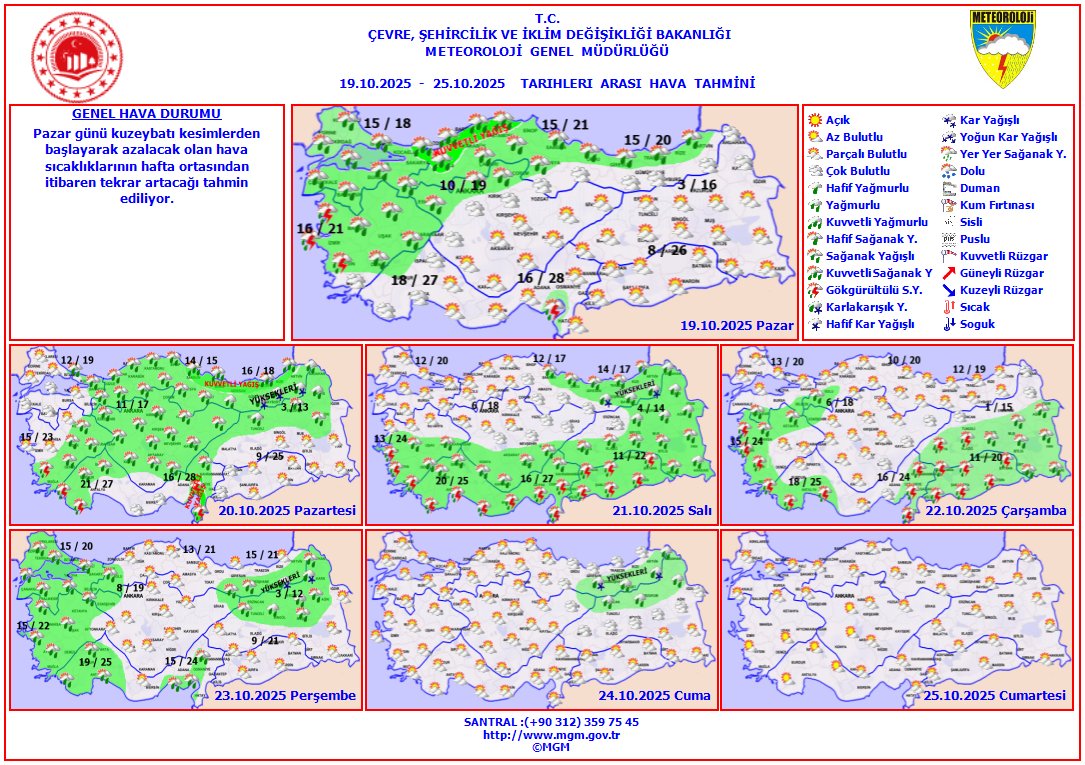 Türkiye genelinde hava durumu parçalı ve yer yer çok bulutlu geçecek. Marmara'nın güney ve doğusu, Ege (Muğla hariç), İç Anadolu’nun kuzeyi, Batı ve Orta Karadeniz, Doğu Karadeniz kıyıları ile Aksaray, Niğde, Nevşehir, Kırşehir, Artvin çevreleri, Adana'nın ve Osmaniye'nin güneyinde sağanak ve gök gürültülü sağanak yağış bekleniyor.