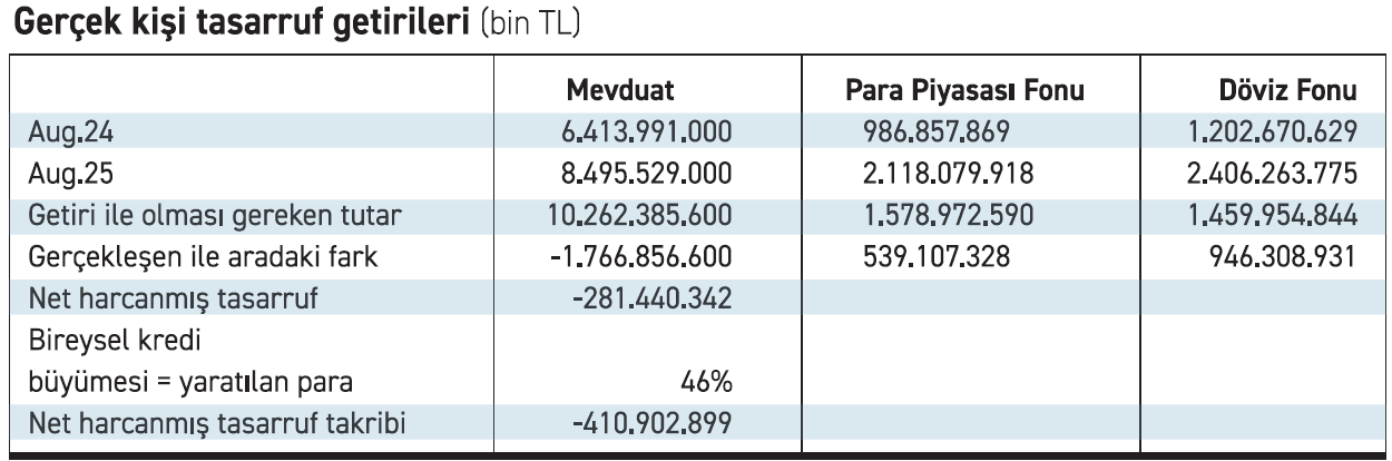 BDDK verilerine göre geçen yıl ağustosta 4.5 trilyon lira olan gerçek kişi TL mevduatları, bu yıl aynı dönemde yüzde 32,45 artarak 8.5 trilyon liraya yükseldi. Ancak ortalama faiz oranları dikkate alındığında bu tutarın 10.3 trilyon liraya ulaşması gerektiği hesaplanıyor. Yani 1.76 trilyon lirayı aşan faiz geliri yeniden mevduata dönmedi.