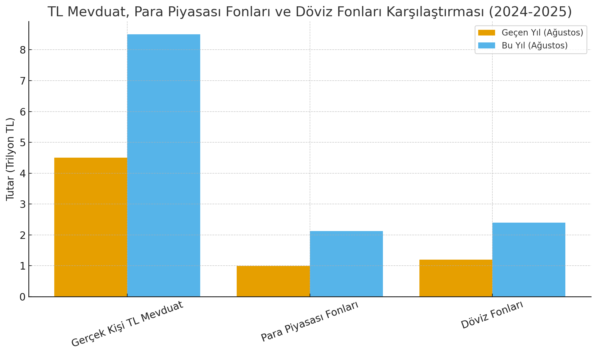 Şebnem Turhan'ın haberine göre, aynı dönemde para piyasası fonları ve döviz fonlarında dikkat çekici artış yaşandı. Para piyasası fonları 986.8 milyar liradan 2.12 trilyon liraya, döviz fonları ise 1.2 trilyon liradan 2.4 trilyon liraya yükseldi. Bu tablo, yatırımcıların mevduat faiz gelirinin bir kısmını fonlara yönlendirdiğini ortaya koyuyor.