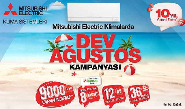 Dev Ağustos kampanyası ile Mitsubishi Electric klimalarda büyük fırsatlar. Mitsubishi Electric Türkiye Klima Sistemleri, kullanıcı dostu kampanyalarına bir yenisini daha ekleyerek ağustos ayında tüketicilere cazip fırsatlar sunuyor. Tüm Mitsubishi Electric klima modellerinde geçerli kampanya kapsamında 9.000 TL’ye varan indirim, 12 aya varan taksit seçeneği ve 10 yıla ulaşan garanti süresiyle, klima sahibi olmak her zamankinden daha kolay hale geliyor.