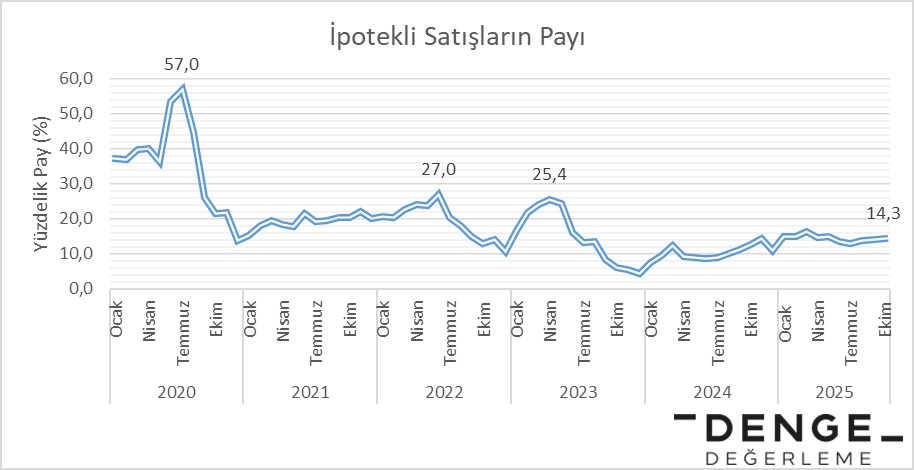Ekim ayında toplam satışlar içinde ipotekli satışların payı yüzde 14,3 seviyesinde kaldı. Geçen yıla göre yüzde 64 artış olsa da hâlâ 2019–2020 dönemindeki yüzde 30–35 bandının oldukça gerisinde.