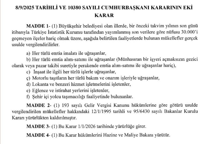 Türkiye’de vergi sistemini yakından ilgilendiren yeni düzenleme Resmi Gazete’de yayımlandı. 8 Eylül 2025 tarihli ve 10380 sayılı Cumhurbaşkanı Kararı’na göre, büyükşehir belediyesi olan illerde nüfusu 30 bini aşan ilçelerde bazı mükellefler artık basit usulden çıkarılarak gerçek usulde vergilendirilecek.