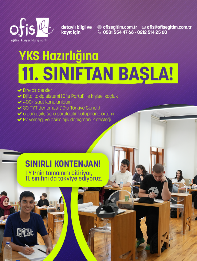 Üniversite sınavına hazırlık artık 11. sınıfta başlıyor. Ofis Eğitim, “YKS’ye Hazırlığa 11. Sınıftan Başla” mottosuyla kapsamlı bir hazırlık süreci sunuyor. Program, sınırlı kontenjanla öğrencilere hem akademik hem psikolojik hem de mental destek vererek sınav maratonuna güçlü bir başlangıç yapma fırsatı tanıyor.