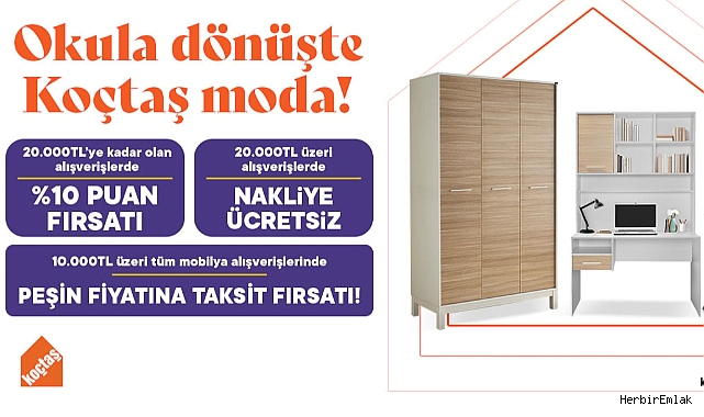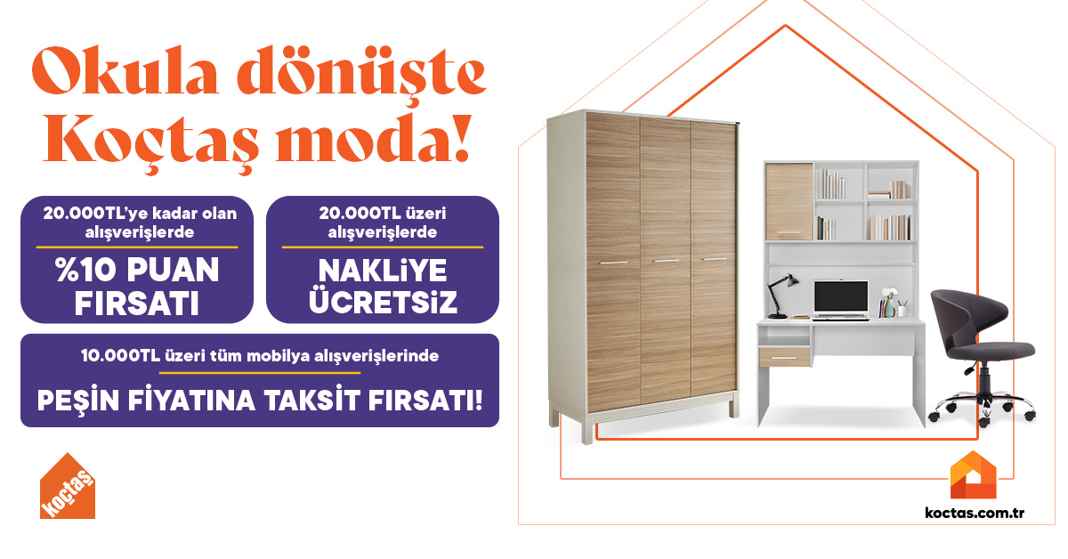 Koçtaş, bu yıl da öğrenciler için hazırladığı özel “Öğrenci Paketleri” ve kitaplıkla birlikte satışa sunulan çalışma masası setleriyle dikkat çekiyor. Ayrıca mobilya reyonunda 20.000 TL’ye kadar alışverişlerde %10 Koçtaş Puan/Kupon Kodu fırsatı, 20.000 TL üzeri alışverişlerde ücretsiz nakliye ve 10.000 TL üzeri tüm mobilya alışverişlerinde peşin fiyatına taksit imkânı sağlanıyor.