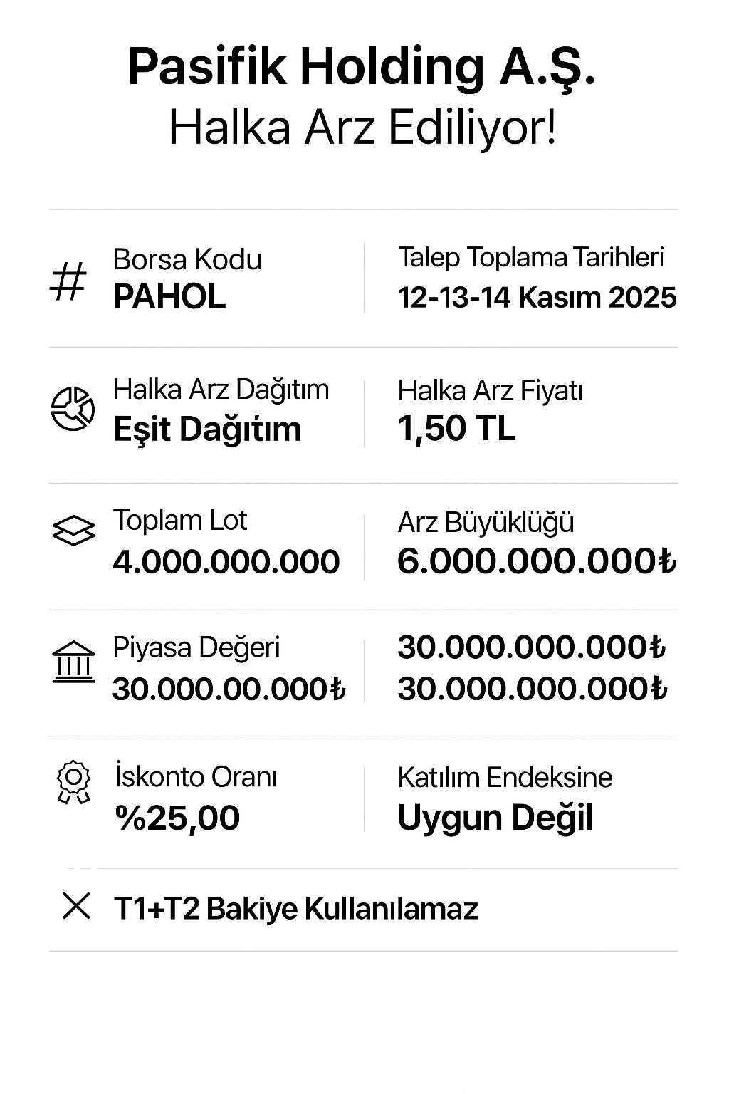 Sermaye Piyasası Kurulu (SPK) onaylı izahnameye göre, Pasifik Holding hisseleri BIST Yıldız Pazar’da işlem görecek. Yıldız Pazar, Borsa İstanbul’un en prestijli pazarlarından biri olup yüksek işlem hacmine, güçlü finansal yapıya ve yüksek halka açıklık oranına sahip şirketlerin yer aldığı segmenttir.