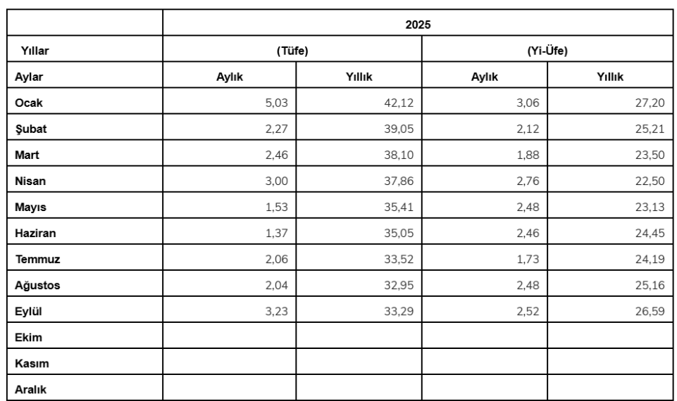 Türkiye İstatistik Kurumu (TÜİK), 2025 yılı ekim ayına ilişkin enflasyon rakamlarını açıkladı. Buna göre, Tüketici Fiyat Endeksi (TÜFE) ekim ayında bir önceki aya göre yüzde 2,55, bir önceki yılın aralık ayına göre yüzde 28,63, bir önceki yılın aynı ayına göre yüzde 32,87 ve on iki aylık ortalamalara göre yüzde 37,15 oranında arttı.