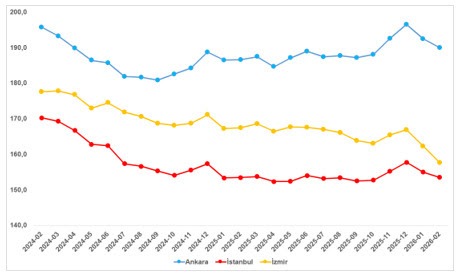 Reel konut fiyat endeksi şubat ayında üç büyük şehirde de düşüş gösterdi:
