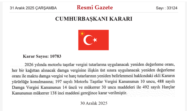2026 yılına ilişkin vergi ve harç artış oranları Resmi Gazete’de yayımlandı. Cumhurbaşkanı Kararı ile, normal şartlarda yüzde 25,49 olarak uygulanması gereken yeniden değerleme oranı; damga vergisi, harçlar ve motorlu taşıtlar vergisi (MTV) için yüzde 18,95 seviyesine düşürüldü.
