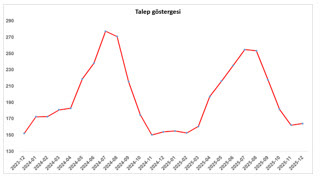 Şekil 1: Türkiye genelinde satılık konut reel fiyatlarının yıllık değişimi (%)Konut talebinde yükselişTalep endeksi aralık ayında bir önceki aya göre yüzde 7,2 artış gösterirken, geçen yılın aynı dönemine kıyasla ise yüzde 11,3 daha yüksek seviyede gerçekleşti.Şekil 2: Talep göstergesi (2020 Nisan=100)