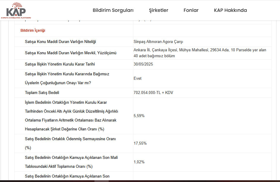 “Sistemi Yönetim Kurulu 30.05.2025 tarihinde toplanarak; sahibi olduğumuz Ankara İli, Çankaya İlçesi, Mühye Mahallesi, 29634 ada, 10 parselde yer alan 40 adet bağımsız bölümden oluşan Sinpaş Altınoran Agora Çarşı'nın Servet Gayrimenkul Yatırım Ortaklığı A.Ş.'ne ("Servet GYO") KDV hariç 702.054.000 TL bedelle satışının gerçekleştirilmesine, Servet GYO’dan KDV hariç 702.054.000 TL toplam satış bedelini ödeme planına göre 25 taksitte tahsilat yapılması, söz konusu satış işlemine ilişkin şirketimiz ile Servet GYO arasında satış vaadi sözleşmesinin imzalanmasına karar verilmiştir.”
