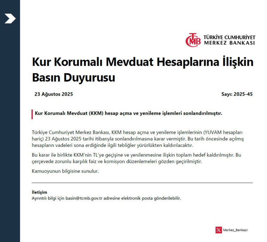 Merkez Bankası’nın açıklamasına göre, KKM’den çıkış süreci tamamlandı. Daha önce tüzel kişiler için şubat ayında kapatılan sistem, artık bireysel müşteriler için de sonlandırıldı. Yalnızca YUVAM hesaplarının bu kararın dışında tutulacağı belirtildi.