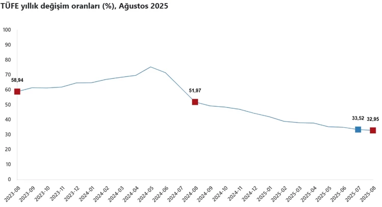 Türkiye İstatistik Kurumu (TÜİK), 2025 yılı ağustos ayı enflasyon rakamlarını kamuoyuyla paylaştı. Buna göre Tüketici Fiyat Endeksi (TÜFE) ağustos ayında aylık yüzde 2,04, yıllık bazda ise yüzde 32,95 artış gösterdi.