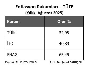 Enflasyon Araştırma Grubu (ENAG) ise E-TÜFE verilerini duyurdu. ENAG’a göre ağustos ayında fiyat artışı yüzde 3,23, yıllık enflasyon ise yüzde 65,49 oldu. TÜİK ile ENAG verileri arasındaki makasın devam ettiği görüldü.
