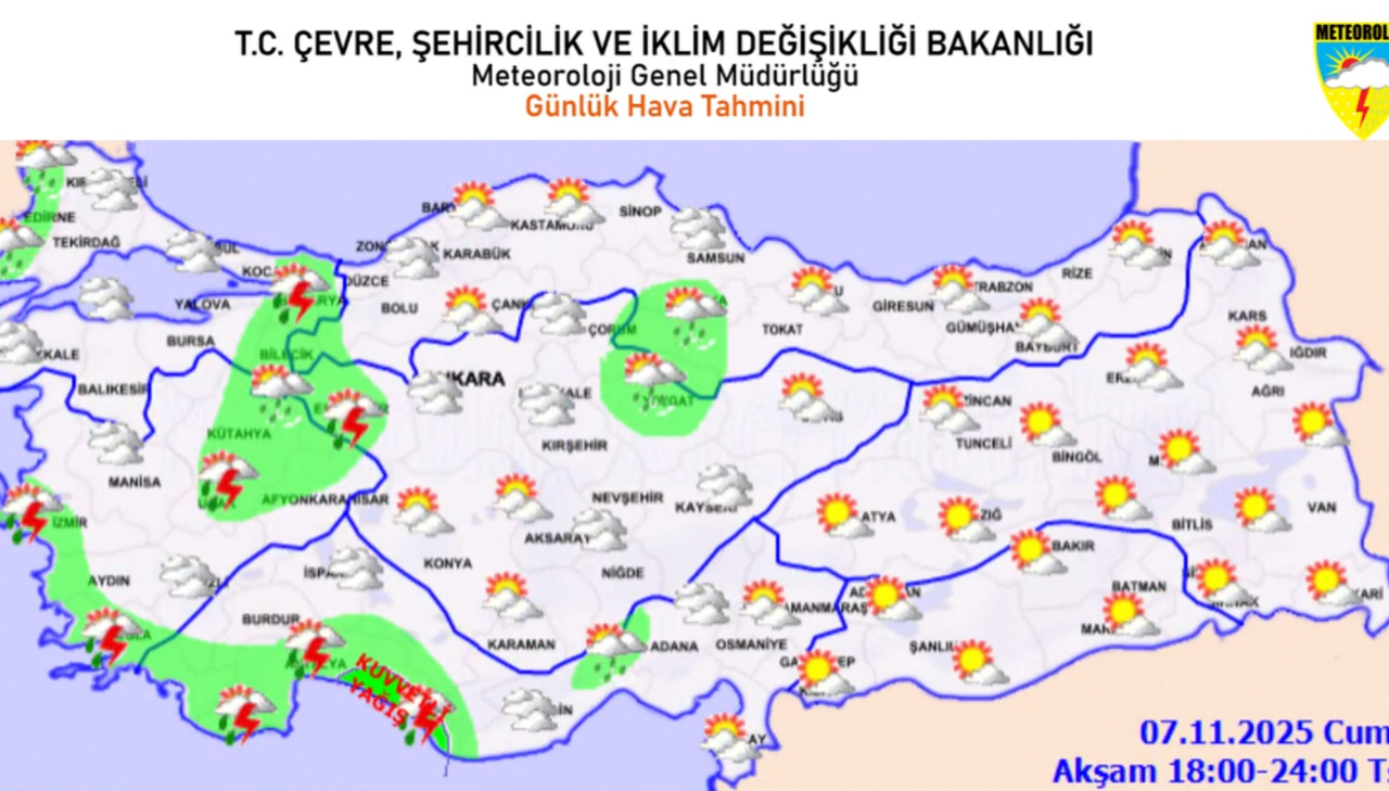 Meteoroloji’den yapılan açıklamada, “Kırklareli kıyıları, Antalya çevreleri ile Mersin'in Toroslar mevkiinde yer yer kuvvetli yağış beklenmektedir. Ani sel, su baskını, yıldırım ve ulaşımda aksamalar gibi olumsuzluklara karşı dikkatli ve tedbirli olunmalıdır.” ifadeleri kullanıldı.