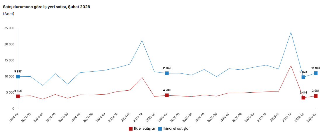 Türkiye genelinde ilk el iş yeri satış sayısı, şubat ayında geçen yılın aynı ayına göre yüzde 5,2 azalarak 3 bin 981 oldu. Buna karşılık ikinci el iş yeri satışları ise yüzde 0,4 artarak 11 bin 88 olarak kaydedildi.