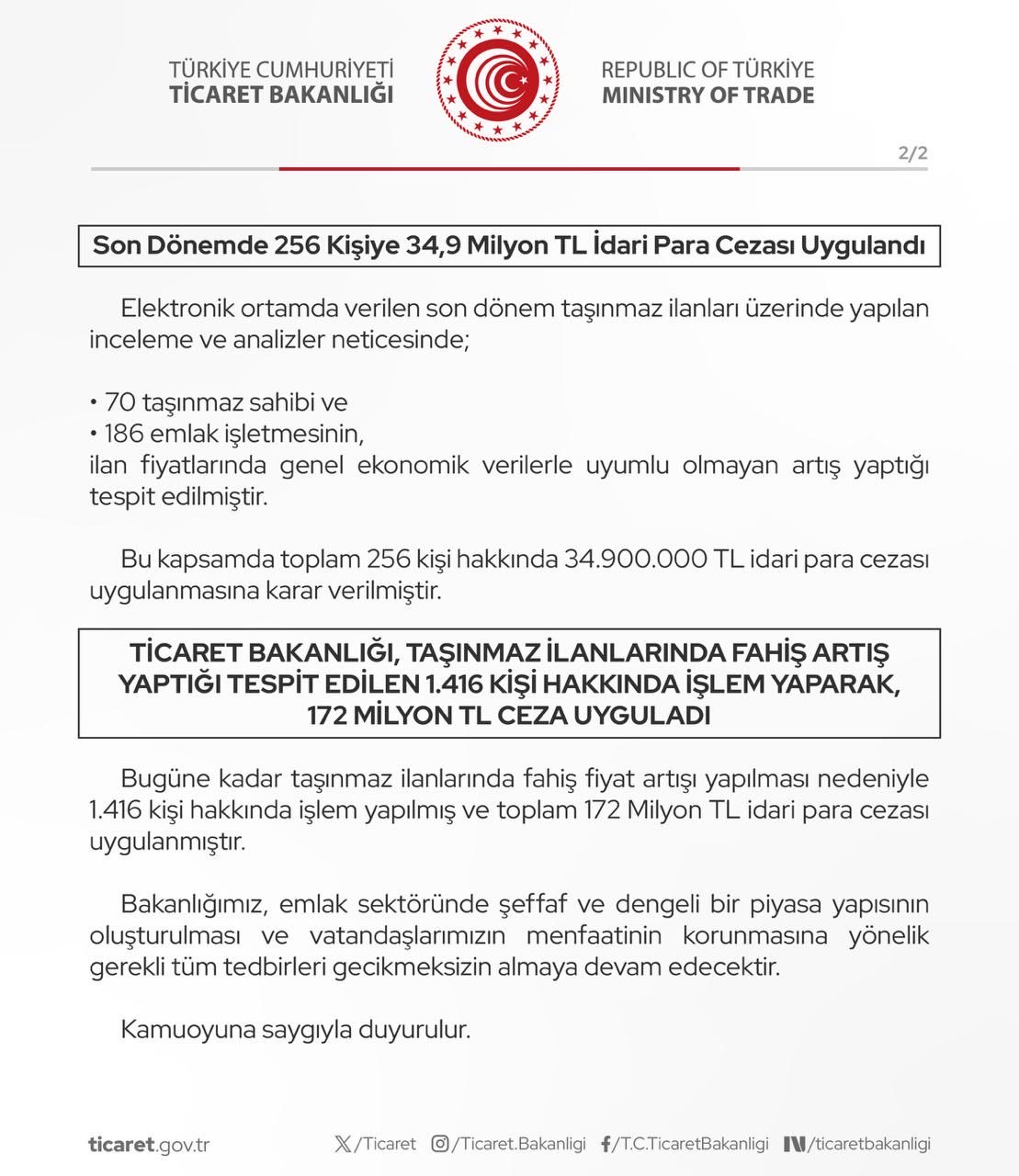 Ticaret Bakanlığı, gayrimenkul piyasasında son dönemde yaşanan fahiş fiyat artışlarına yönelik denetimlerini sürdürüyor. Yapılan açıklamaya göre, genel ekonomik verilerle uyumlu olmayan ve haklı bir gerekçeye dayanmayan fiyat artışları tespit edilen 1.416 kişi hakkında işlem yapılarak toplam 172 milyon TL idari para cezası kesildi.