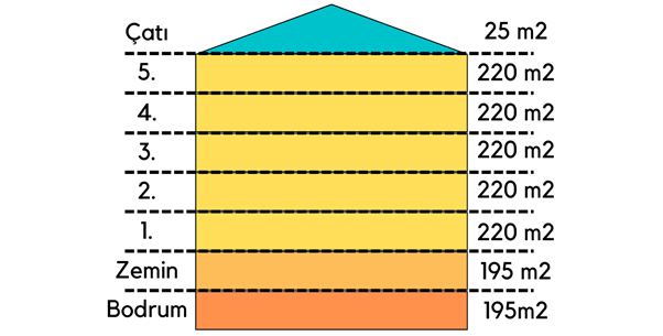 5 normal kat: 220 m² x 5 = 1.100 m²