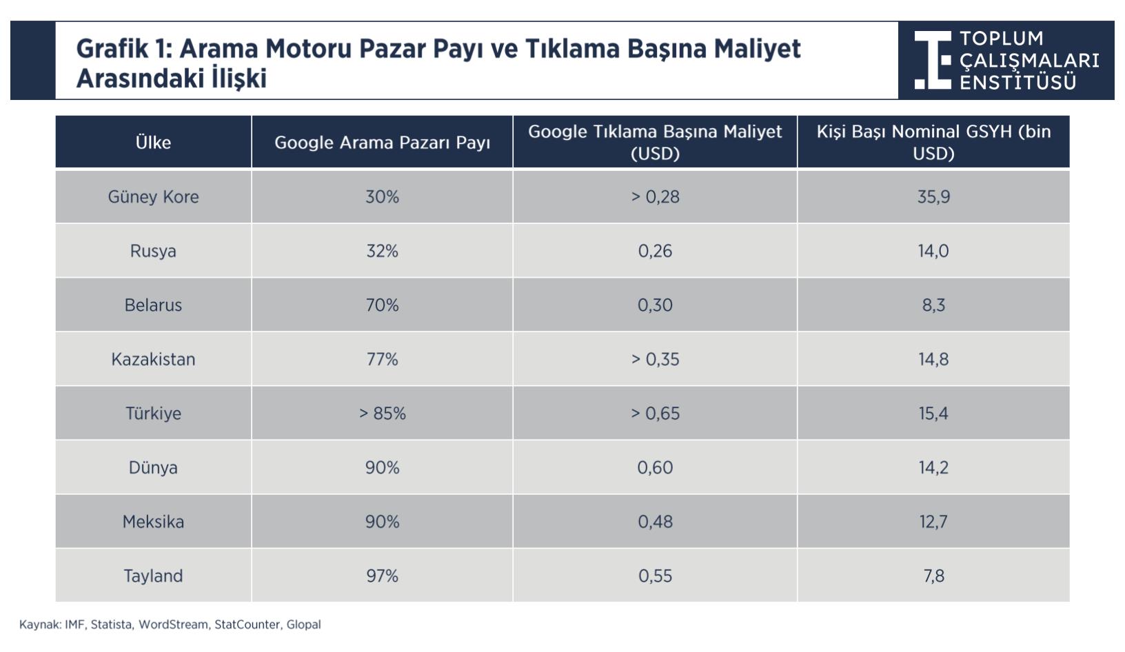 Toplum Çalışmaları Enstitüsü’ne göre dijital platform yoğunlaşması Türkiye ekonomisi açısından marjinal değil, sistemik bir etki yaratıyor. Raporda, dijital reklamcılık ve arama hizmetleri pazarlarında rekabetin artırılmasının; e-ticaretin derinleşmesi, KOBİ’lerin dijitalleşmesi, turizm sektörünün rekabet gücü ve tüketici refahı açısından kritik önem taşıdığı vurgulandı.