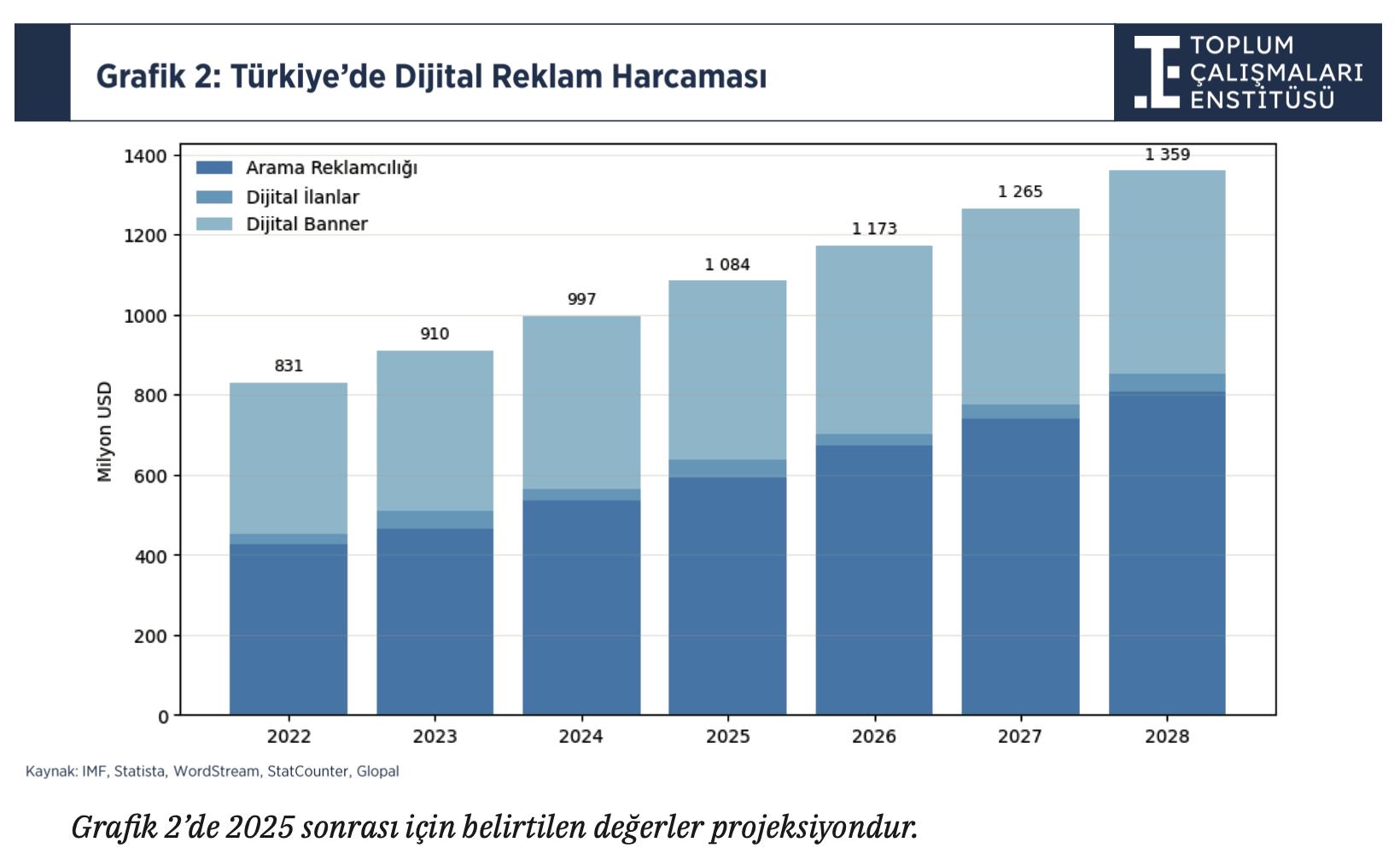Ankara merkezli düşünce kuruluşu Toplum Çalışmaları Enstitüsü, “Dijital Reklamcılık Raporu”nu kamuoyuyla paylaştı. Enstitü Başkanı Av. Dr. Yavuz Selim Günay ile Araştırma ve Veri Analizi Programı Direktörü Yağmur Uzunırmak’ın imzasını taşıyan raporda; dijital reklamcılık sektörünün Türkiye ekonomisindeki ağırlığı, arama hizmetlerindeki yoğunlaşma, mobil uygulama mağazalarının gelir yapısı ve bu alanların reel sektör