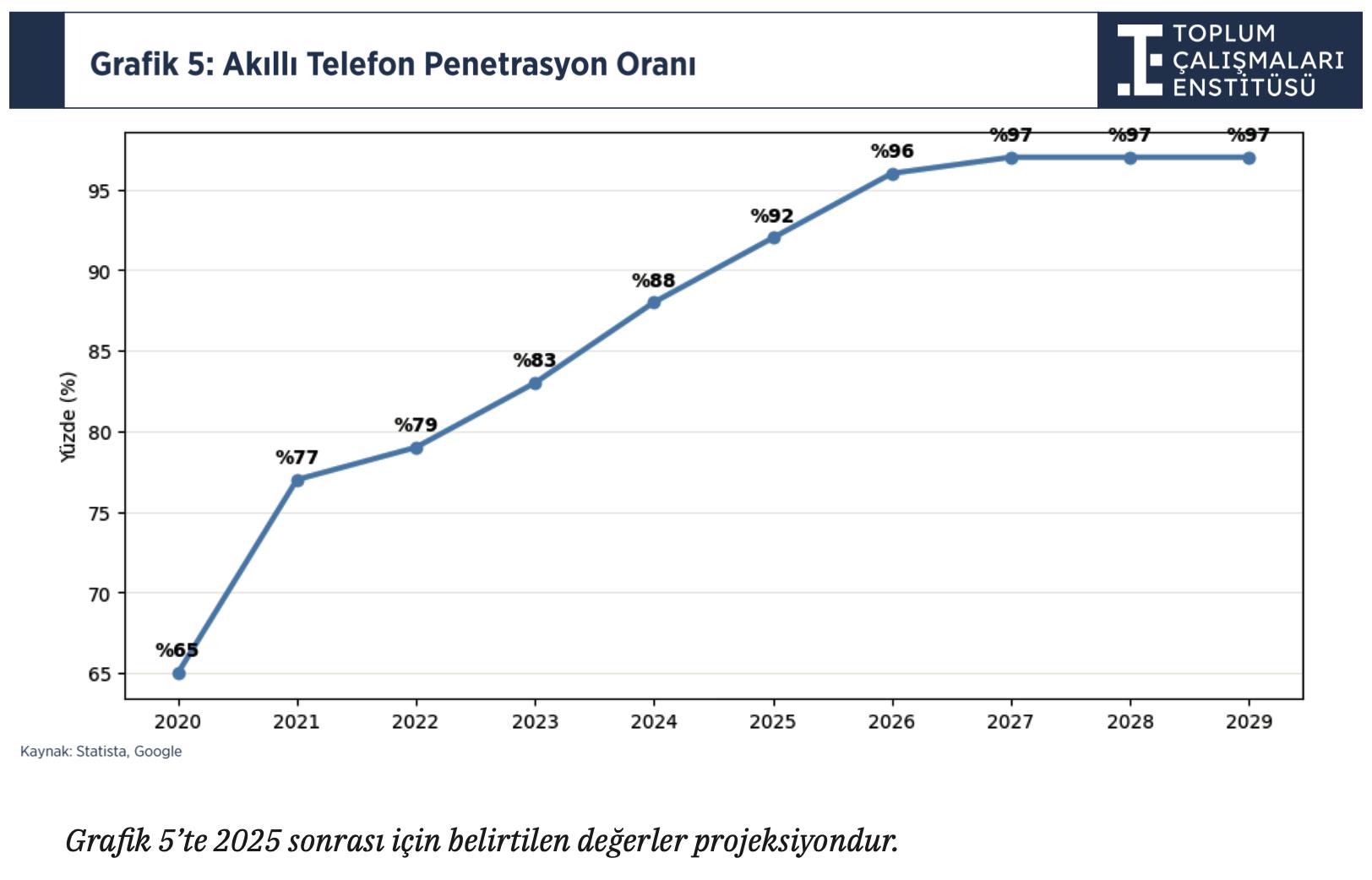 Türkiye’de akıllı telefon kullanım oranı 2020’de yüzde 65 seviyesindeyken 2026 itibarıyla yüzde 96’ya ulaştı. 2027 sonrasında ise yüzde 97 seviyesinde yatay seyir öngörülüyor.