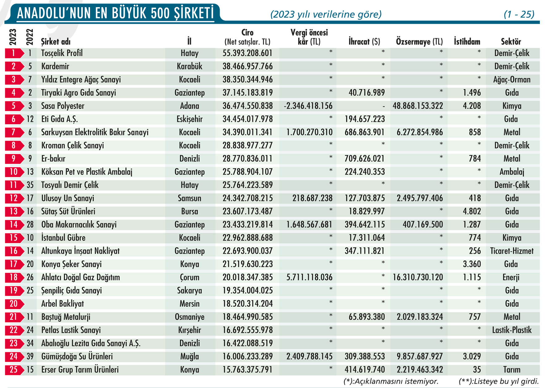 oturdu. Bu yıl Anadolu 500 tarihinde bir ilk yaşandı ve listenin ilk iki sırasını aynı holdingin iştirakleri paylaştı. Tosyalı Holding’in iştirakleri olan Tosçelik ve Tosyalı Demir Çelik’in ilk iki sırayı paylaşmasıyla listede bir ilk yaşanırken, Tiryaki Agro’nun hızlı yükselişi sektörde “Anadolu’nun yeni devleri” tartışmasını başlattı. Şirketin özellikle küresel tarım ürünleri tedarikindeki büyüme stratejisi ve güçlü dış pazar ağı, sıralamadaki bu sıçramanın temel nedenleri arasında gösteriliyor.