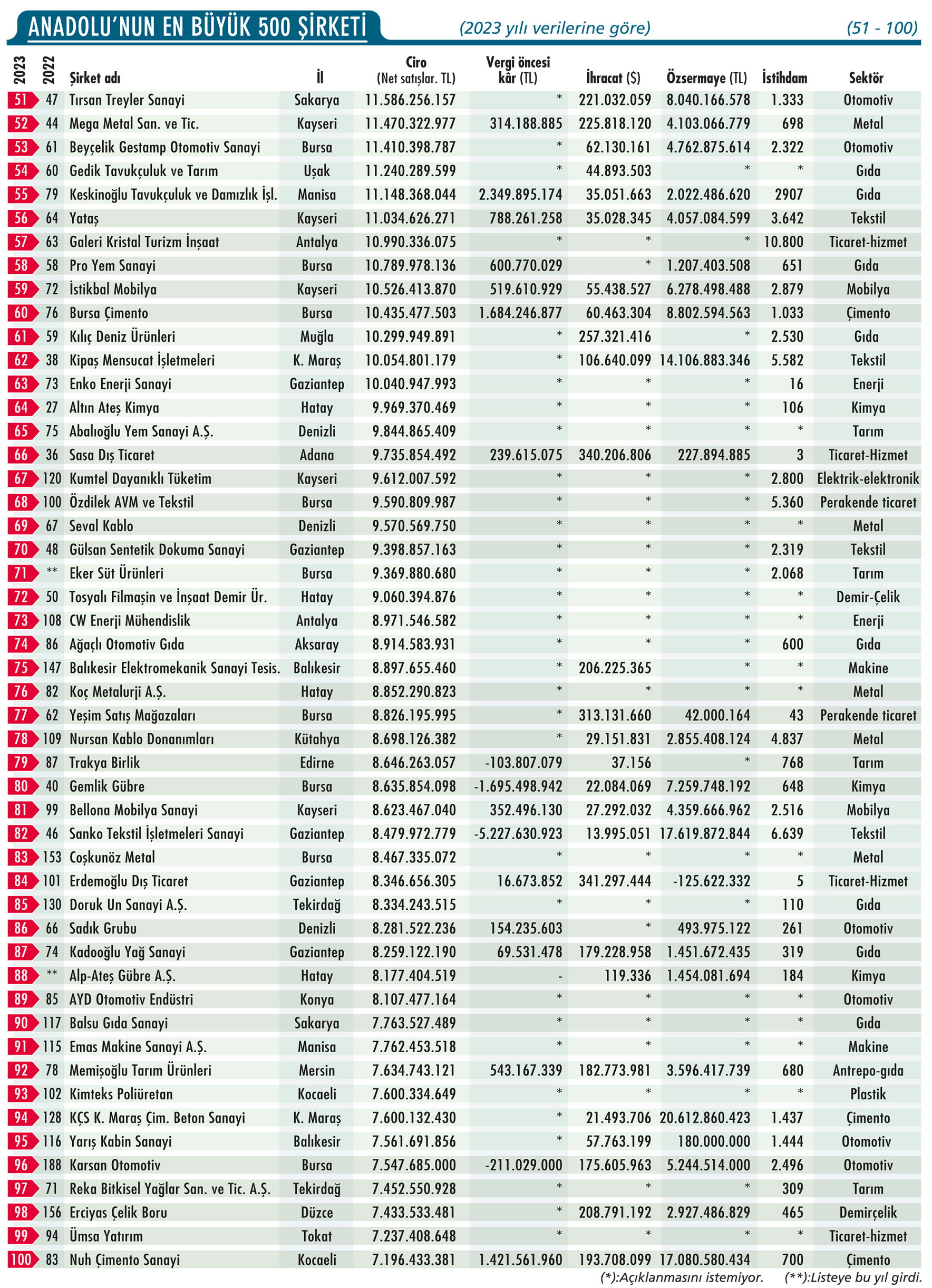 Tiryaki Agro ise tüm bu olumsuz tabloya rağmen performansıyla dikkat çekti. Tarımsal emtia ticareti ve işleme kapasitesindeki genişleme, şirketi 2024 sıralamasının en büyük kazananlarından biri yaptı. Anadolu’nun üretim gücünün dinamiklerini değiştiren bu çıkış, önümüzdeki yıllarda sıralamanın üst basamaklarında rekabetin daha da kızışacağına işaret ediyor.