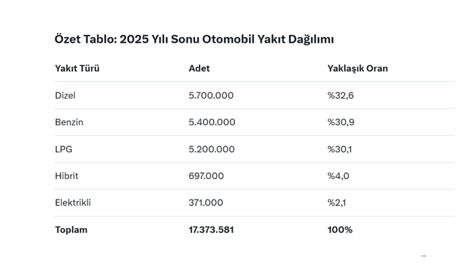 2025 yılı sonu itibarıyla Türkiye'deki trafiğe kayıtlı otomobil sayısı 17 milyon 373 bin 581 adede ulaştı (TÜİK verileri). Bu rakam, yakıt türlerine göre dağılımıyla birlikte otomotiv sektöründeki dönüşümü net bir şekilde gözler önüne seriyor.İşte yakıt türlerine göre dağılım: