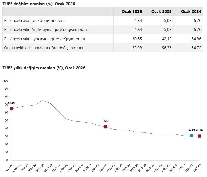 Türkiye İstatistik Kurumu (TÜİK), 2026 yılının ilk enflasyon rakamlarını kamuoyuyla paylaştı. Açıklanan verilere göre Tüketici Fiyat Endeksi (TÜFE), ocak ayında bir önceki aya göre yüzde 4,84 oranında artış gösterdi. Yıllık enflasyon ise yüzde 30,65 seviyesinde gerçekleşti.