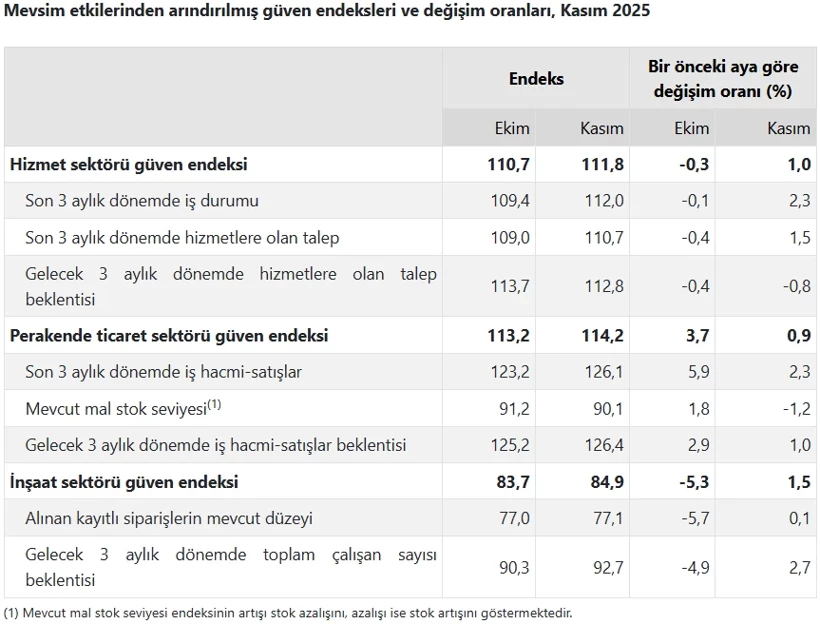 Böylece kasım ayında güven endeksleri; hizmet sektöründe yüzde 1,0, perakende ticarette yüzde 0,9 ve inşaat sektöründe yüzde 1,5 oranında artış göstermiş oldu.