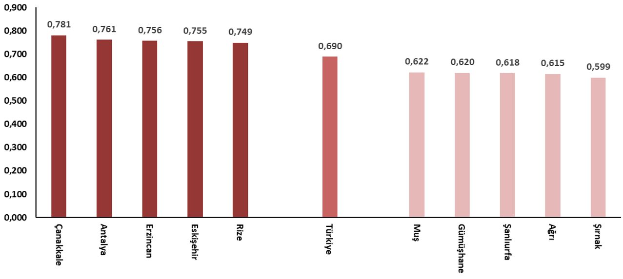 En düşük endekse sahip il ise 0,599 puan ile Şırnak olarak kayıtlara geçti. Şırnak’ın ardından Ağrı, Şanlıurfa, Gümüşhane ve Muş en düşük puanlı iller arasında yer aldı.