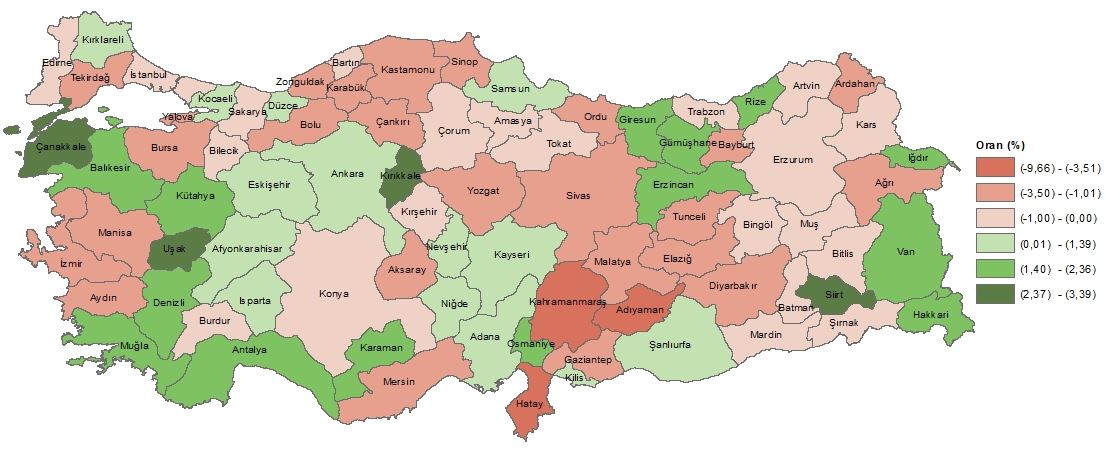 Endeksin en çok gerilediği iller ise Hatay (-0,066), Adıyaman (-0,059), Kahramanmaraş (-0,048), Manisa (-0,024) ve Malatya (-0,022) oldu.