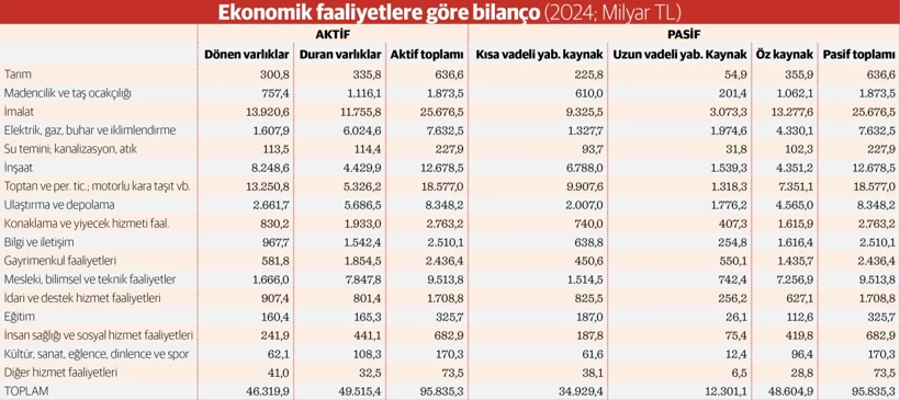 Toplam aktifler önceki yıla göre yüzde 38,6 artış kaydetti. Bu büyüklüğün 48,6 trilyon TL’si öz kaynaklardan, 47,2 trilyon TL’si ise borçlardan oluştu. Firmaların toplulaştırılmış bilançosuna göre, öz kaynakların toplamı 48 trilyon 604 milyar TL, kısa ve uzun vadeli yabancı kaynaklar toplamı ise 47 trilyon 230 milyar TL oldu.