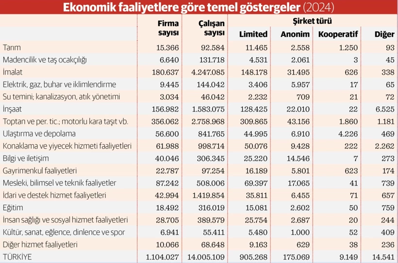 Sektörel dağılımda en fazla firmanın bulunduğu alan, 356 bin 62 işletme ile toptan ve perakende ticaret; motorlu kara taşıtlarının ve motosikletlerin onarımı oldu. Bunu 180 bin 637 işletme ile imalat sanayi, 156 bin 982 işletme ile inşaat sektörü izledi.