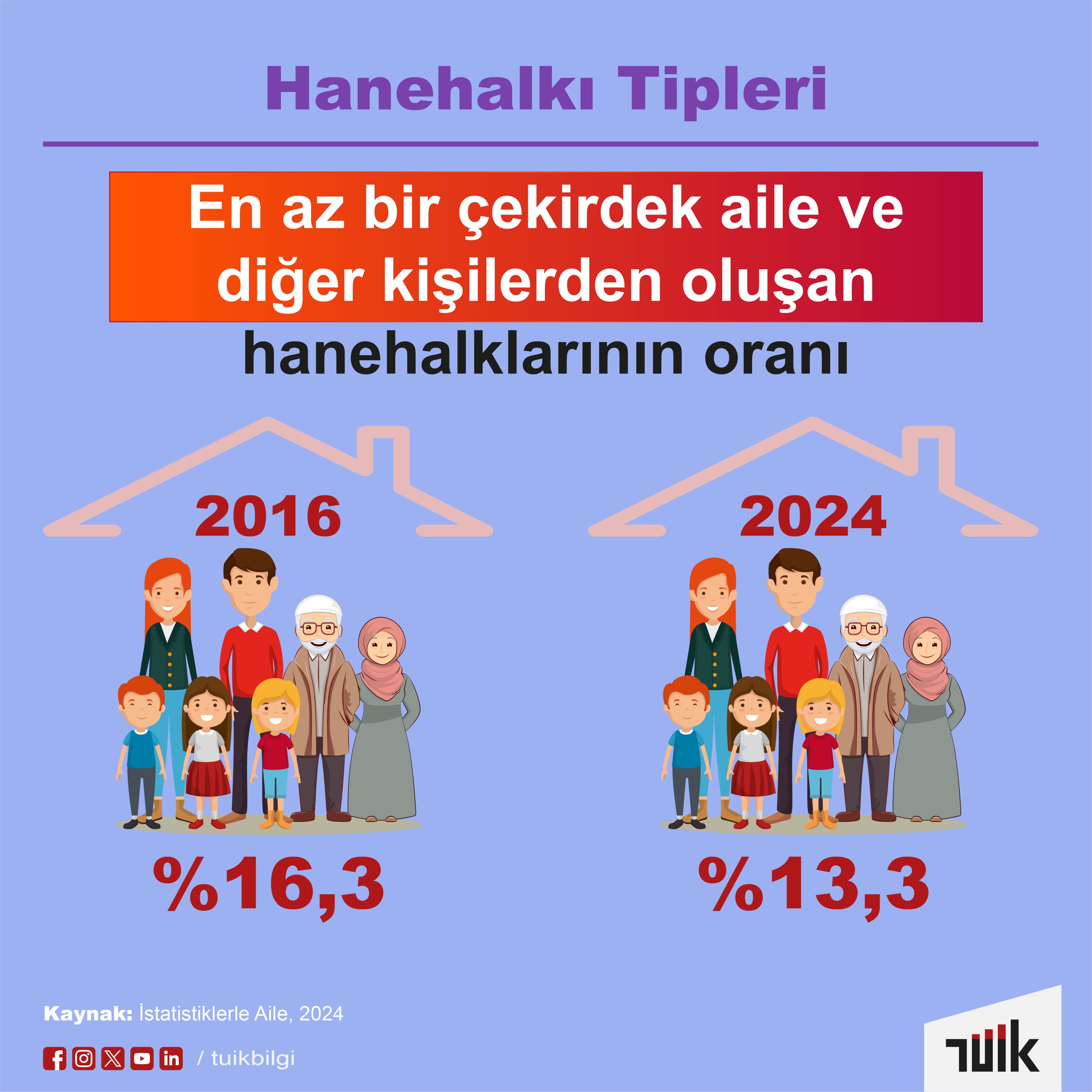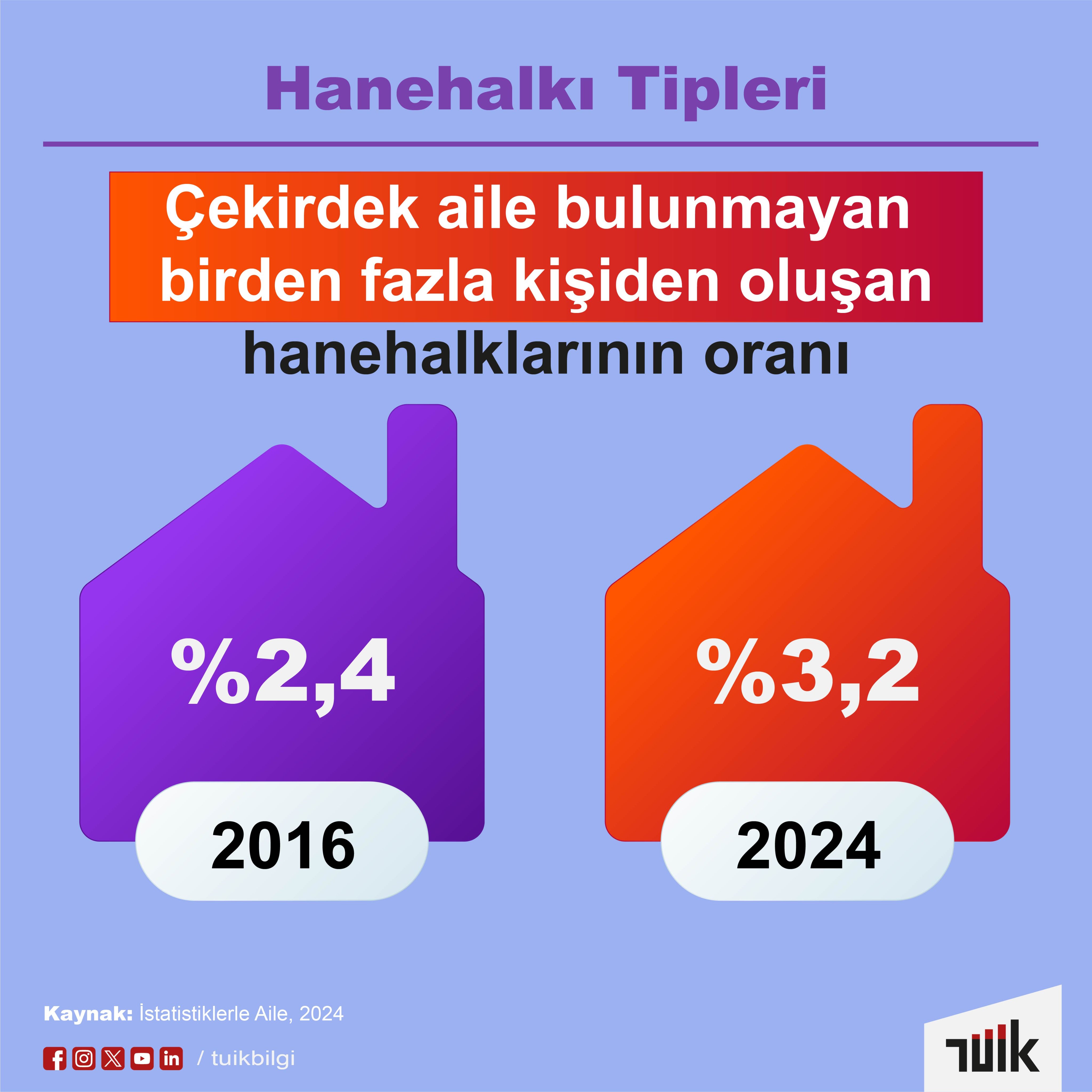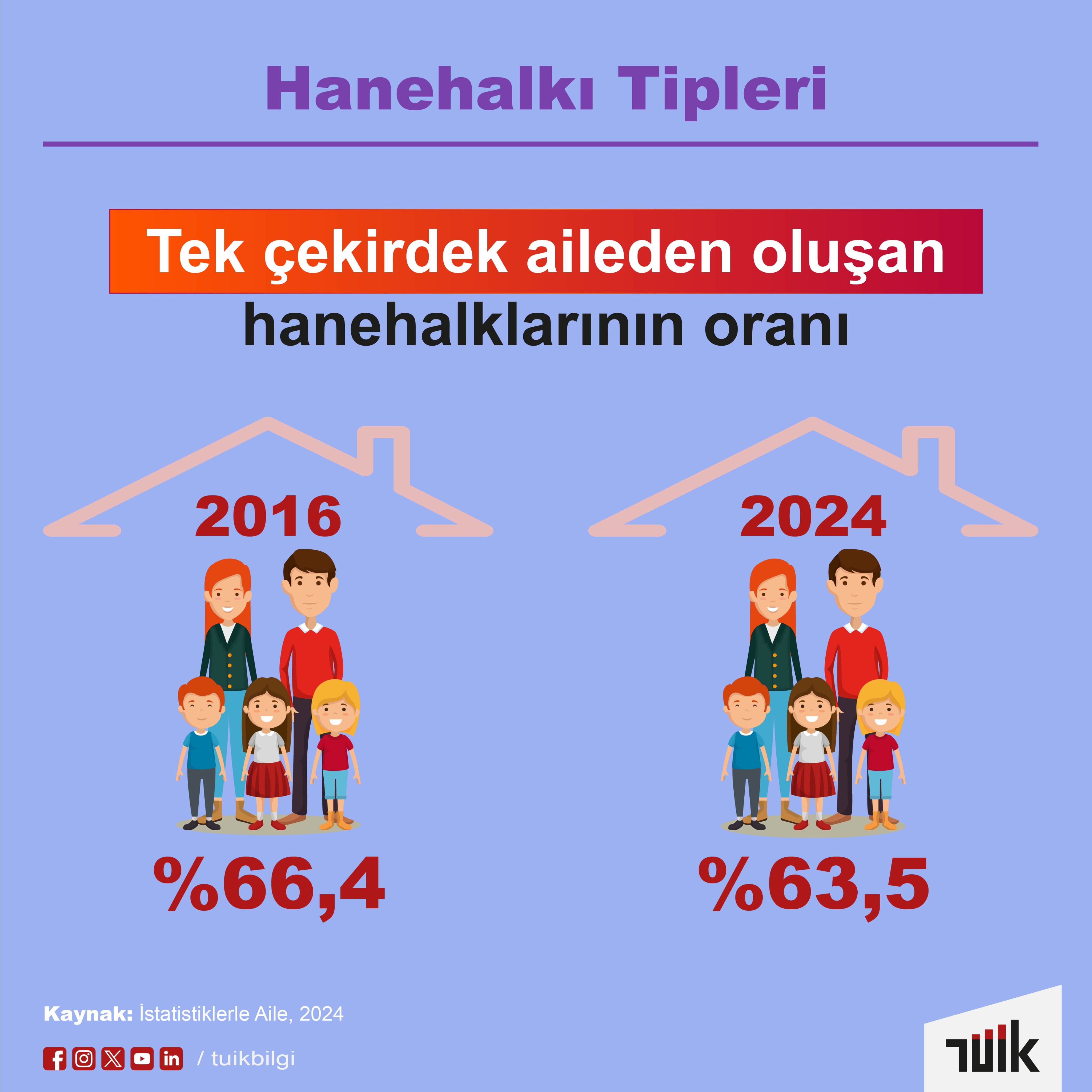 2016 yılında %14,9 olan tek kişilik hanehalklarının oranı 2024’te %20’ye çıktı. Bu oran Gümüşhane'de %31,7 ile zirveye ulaştı. En düşük oran ise %11,1 ile Batman’da görüldü. geniş aile oranı ise %13,3’e gerileyerek düşüşünü sürdürdü.