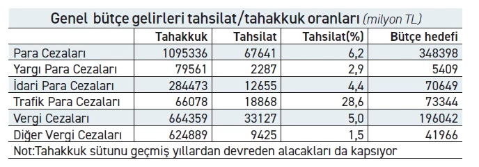 Hüseyin Gökçe'nin Ekonomi gazetesinde yer alan haberine göre, özellikle “diğer vergi cezaları” kalemindeki düşük ödeme performansı dikkat çekti. Bu başlık altında 624 milyar 889 milyon liralık tahakkuka karşılık sadece 9,4 milyar liralık tahsilat yapılırken, ödeme oranı yüzde 1,5 olarak gerçekleşti.