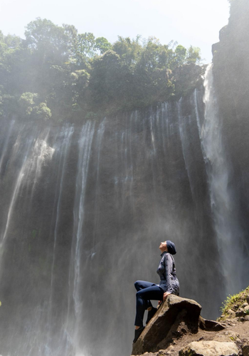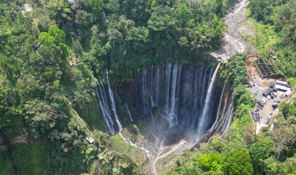 Der erste Stopp ist der Tumpak Sewu Wasserfall, der eigentlich aus mehreren Wasserfällen besteht. Es ist ca. 120 m hoch und ist sowohl von oben an einem Seitensteg, als auch von unten begehbar. Dabei finde ich aber die Drohnenaufnahmen von ganz oben viel spektakulärer da man den ganzen Wasserfall direkt sehen kann. Der Weg, der zum Wasserfall hinunter führt, ist nicht ganz ungefährlich. Da ich ausgerechnet an einem Sonntag hingegangen bin, waren auch sehr viele Leute vor Ort. Nicht nur Touristen, sondern auch sehr viele Einheimische die einen Ausflug zum Wasserfall gemacht haben. Bilder vor dem Wasserfall alleine zu bekommen hat daher ewig gedauert, aber es hat immerhin geklappt.