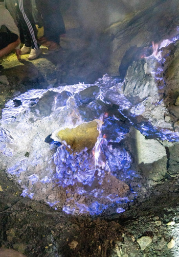 Eine andere Besonderheit, die der Ijen bietet, ist das sogenannte 'Blaue Feuer', das gleichzeitig sehr beliebt ist. Ein entzündetes Schwefelgas, das aus den Rissen hervorkommt und blau-lila aufflammt und nur bei Dunkelheit sichtbar ist. Natürlich mit einer Gasmaske ausgestattet, denn Schwefelgase können sonst gefährlich für Augen und Lunge sein. Das war aber nicht wirklich eine spaßige Angelegenheit, das muss ich sagen. Denn auch durch die Maske hat es sehr gebrannt.