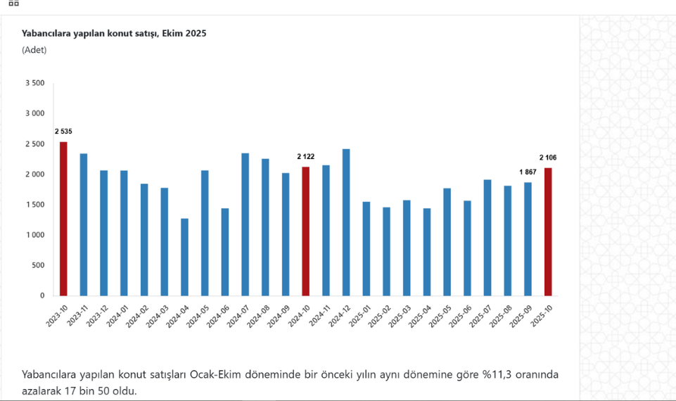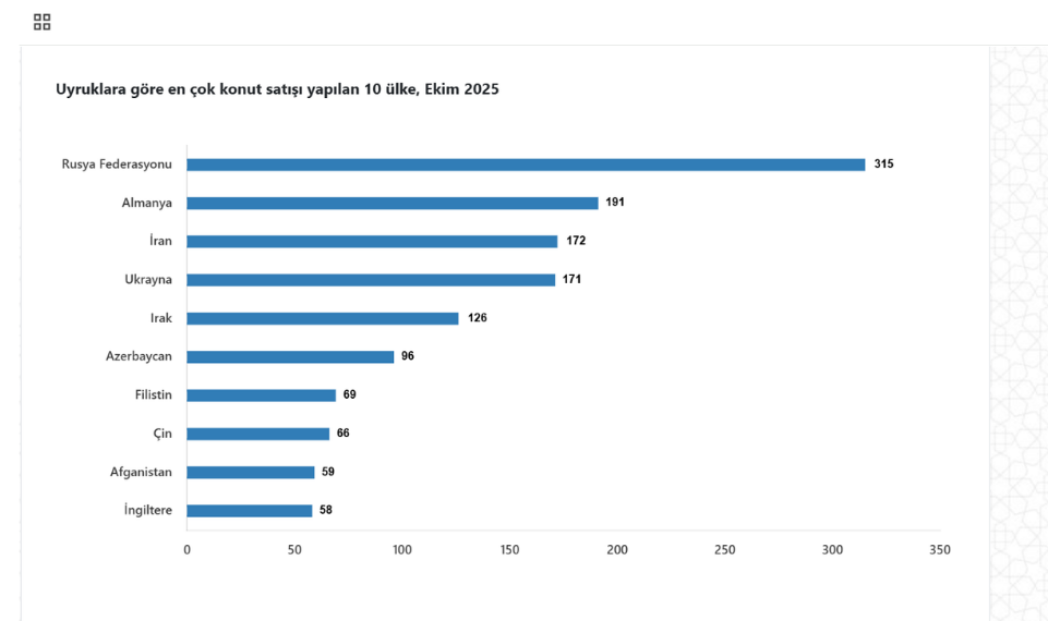 Türkiye İstatistik Kurumu'nun (TÜİK) ocak–ekim dönemine ilişkin konut satış verileri, yabancı yatırımcının Türkiye’deki yeni rotasını ortaya koydu. Buna göre toplam konut satışları 10 ayda 1 milyon 293 bin 33 adede yükselerek geçen yılın aynı dönemine göre yüzde 16,2 arttı.