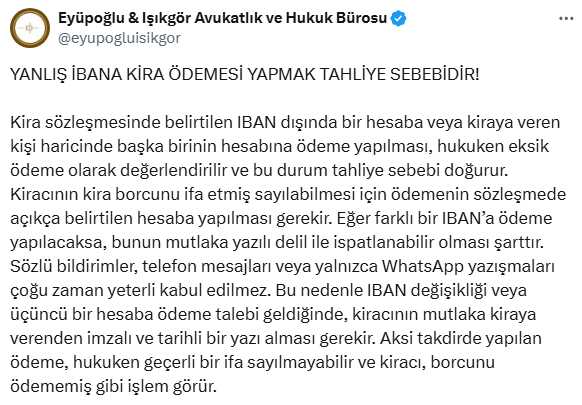 “Kiracılar kira ödemelerini mutlaka sözleşmede yazılı IBAN’a yapmalı. Eğer yeni bir hesap bilgisi verildiyse, bu durum mutlaka yazılı ve imzalı bir belge ile teyit edilmelidir. Aksi halde kiracı, borcunu ödememiş sayılabilir.”