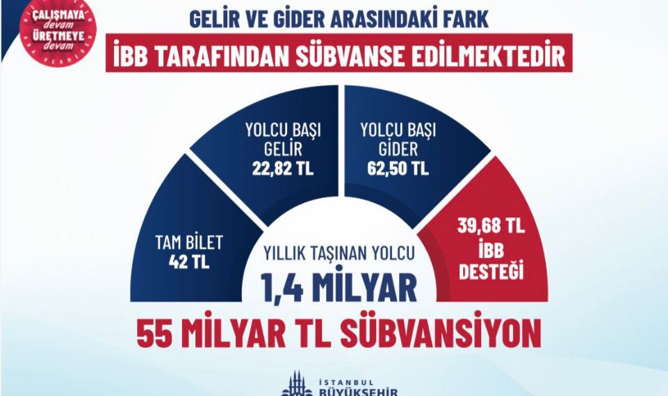 Mevcut ekonomik koşullarda bir yolcunun maliyetinin 62,5 TL olduğunu ifade eden Aslan, ortalama bilet gelirinin ise 22,82 TL seviyesinde kaldığını söyledi. Aradaki 39,68 TL’lik farkın İBB bütçesinden karşılandığını kaydeden Aslan, yalnızca İETT için yıllık 55 milyar TL destek sağlandığını açıkladı.