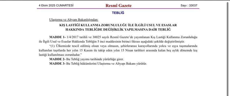 Kış şartlarında trafik güvenliğini artırmak için uygulanan kış lastiği zorunluluğunda süre uzatıldı. Resmi Gazete’de yayımlanan düzenlemeyle daha önce 1 Aralık–1 Nisan tarihleri arasında geçerli olan kış lastiği uygulaması, bundan böyle 15 Kasım–15 Nisan tarihleri arasında uygulanacak.